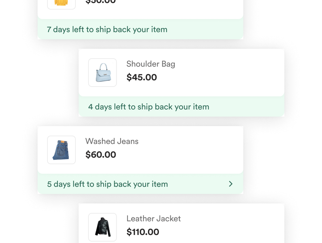 No rush! You’ve got 7 days to get your items in the mail after your instant refund is issued. You’ll receive all the return information you need, plus helpful email and SMS reminders along the way.